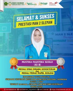 MAN 2 Sleman — Sebuah pencapaian membanggakan kembali diraih oleh salah satu siswa MAN 2 Sleman. Mustika Faustina Susilo (XI B) berhasil meraih medali emas bidang Kedokteran dan medali perak pada mata pelajaran Biologi dalam ajang Indonesian Youth Festival: Semarak Inspirasi Medis dan Olimpiade Nasional Indonesia (SIMFONI). Kompetisi ini merupakan hasil kolaborasi IYFEST dan UNY, yang digelar pada 25–26 Oktober 2025 sebagai bagian dari peringatan Hari Dokter Nasional.