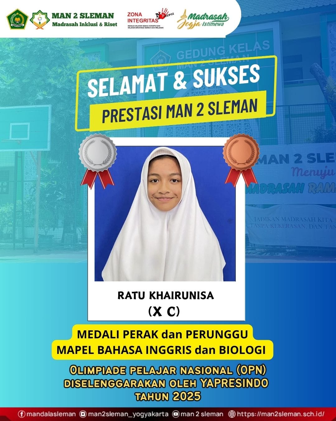 MAN 2 Sleman – Ratu Khairunisa, siswi kelas X C MAN 2 Sleman, kembali mengharumkan MAN 2 Sleman dengan meraih dua prestasi sekaligus pada ajang Olimpiade Pelajar Nasional (OPN) 2025. Ia berhasil menyabet medali perak di bidang Bahasa Inggris dan medali perunggu di bidang Biologi jenjang SMA/MA. Kompetisi bergengsi ini diselenggarakan oleh Yapresindo secara online pada 21 September 2025 dan diikuti oleh peserta dari berbagai jenjang pendidikan, mulai dari SD/MI hingga Perguruan Tinggi.