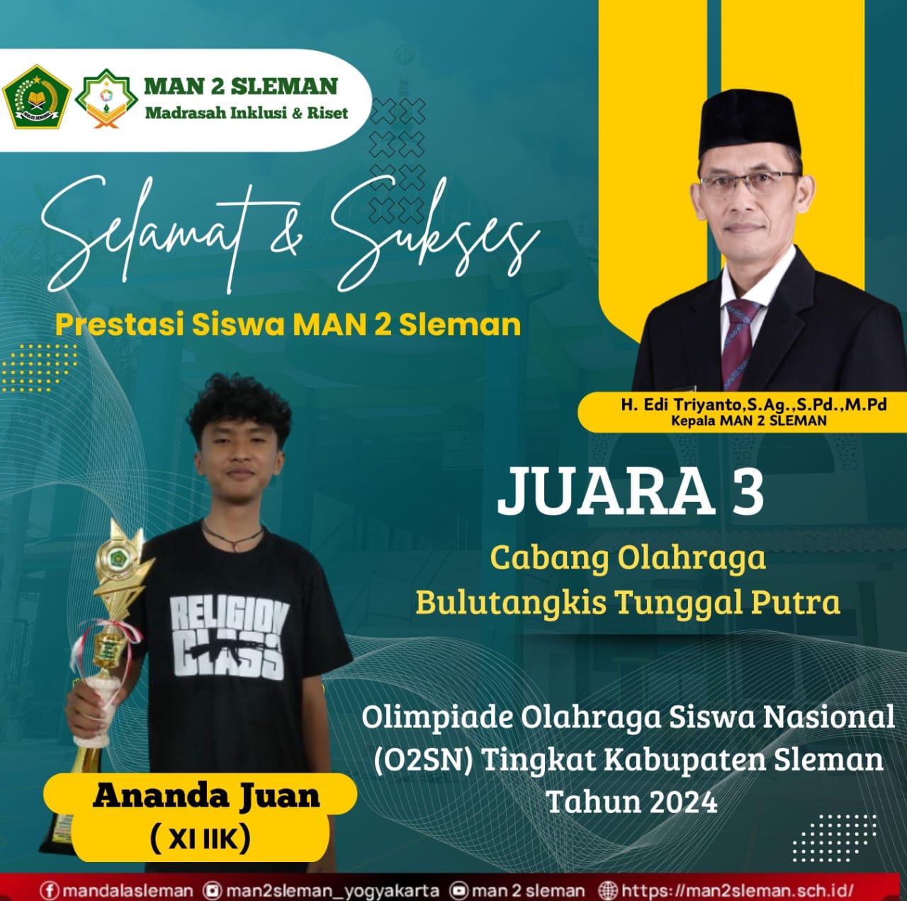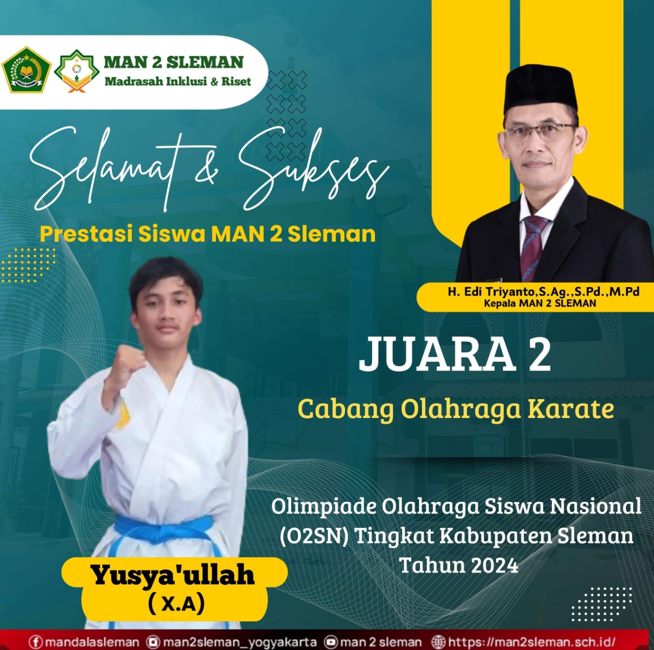 Sleman (MAN 2 Sleman)- Dua siswa MAN 2 Sleman berhasil meraih medali perak dan perunggu pada Olimpiade Olahraga Siswa Nasional (O2SN) Tingkat Kabupaten Sleman Tahun 2024 (20-21/05/2024). Adalah Yusya’ullah siswa kelas XC meraih medali perak pada cabang oleharaga karate dan Ananda Juan siswa kelas XI Keagamaan meraih medali perunggu pada cabang olahraga bulutangkis tunggal putra.