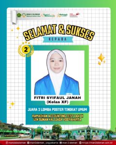 Sleman (MAN 2 Sleman)  — Prestasi membanggakan kembali ditorehkan oleh murid MAN 2 Sleman. Fitri Syifaul, murid kelas X F, berhasil meraih Juara 2 Lomba Digital Poster Tingkat Umum se- DIY dalam ajang Ramadhan Accounting Fest (RAFEST) 1447 H/2026 yang diselenggarakan oleh Himpunan Mahasiswa Akuntansi Syariah UIN Sunan Kalijaga Yogyakarta.