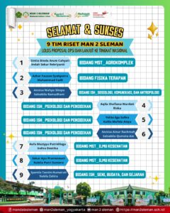 Sleman (MAN 2 Sleman) – Prestasi membanggakan kembali ditorehkan oleh siswa MAN 2 Sleman dalam ajang Olimpiade Penelitian Siswa Indonesia (OPSI) 2026. Sebanyak sembilan tim riset berhasil lolos tahap seleksi proposal dan melaju ke tingkat nasional, membawa beragam inovasi dari bidang sains hingga sosial humaniora.