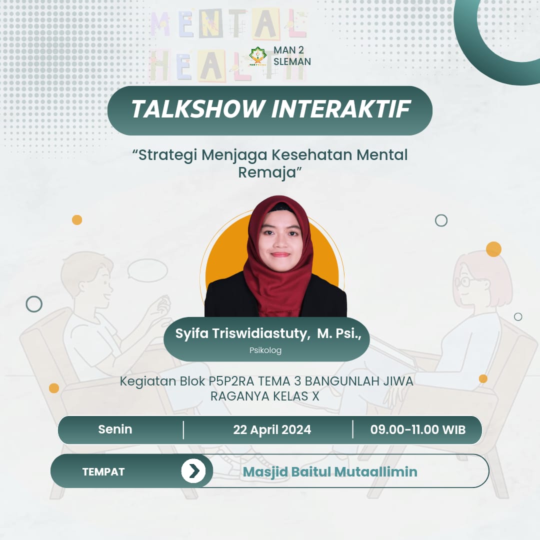 Sleman (MAN 2 Sleman)— MAN 2 Sleman melaksanakan Proyek Penguatan Profil Pelajar Pancasila (P5) dan Profil Pelajar Rahmatan Lil Alamin (P2RA). Kegiatan hari pertama Blok P5P2RA Tema 3 “Bangunlah Jiwa Raganya” dimulai dengan talkshow interaktif pada Senin (22/04/24) pukul 09.00 – 11.00. Kegiatan ini diikuti oleh seluruh siswa kelas X dan didampingi fasilitator. “Strategi Menjaga Kesehatan Mental Remaja” menjadi Tema dalam Talkshow interaktif ini. Narasumber dalam kegiatan ini ialah psikolog Puskesmas Depok I Syifa Triwidiastuty, M. Psi.