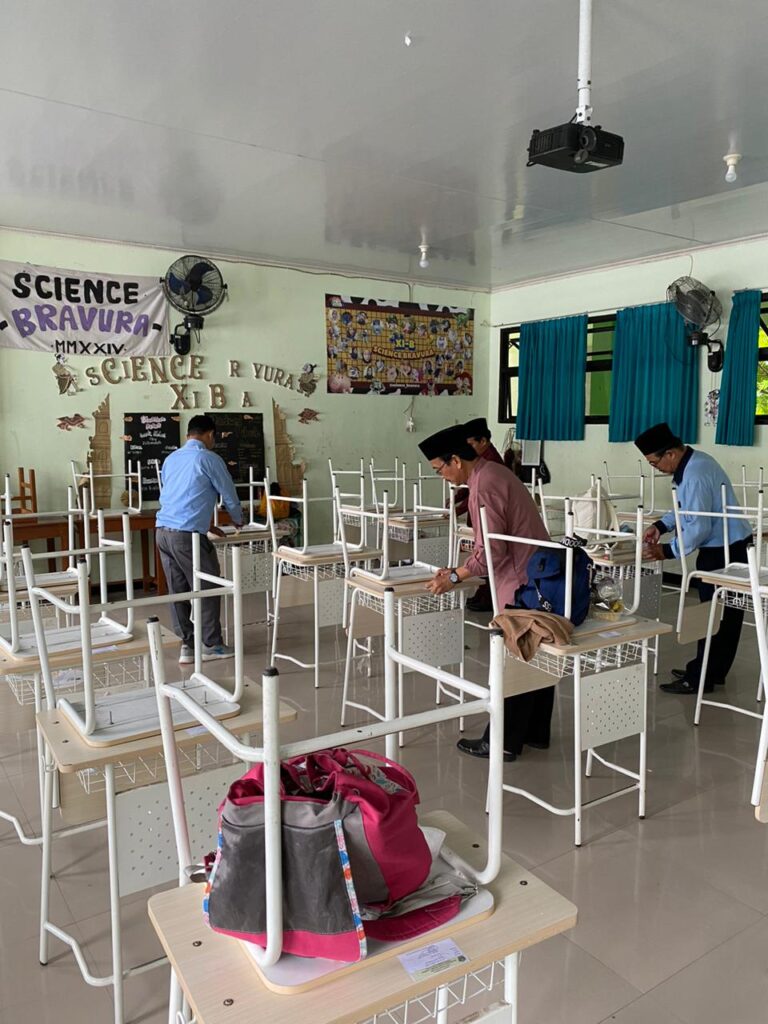 Selain itu, panitia juga melakukan persiapan ruangan ujian secara menyeluruh. Kursi dan meja ditata sesuai ketentuan, nomor ujian ditempel di setiap meja peserta, serta daftar nama peserta dipasang di pintu masing-masing kelas. Kebersihan dan kerapian ruangan turut diperhatikan demi kenyamanan siswa saat mengerjakan soal.