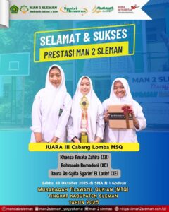 MAN 2 Sleman – MAN 2 Sleman kembali menunjukkan prestasi membanggakan dengan meraih juara 3 pada kompetisi Musabaqah Tilawatil Qur’an (MTQ) Kabupaten Sleman tahun 2025. Kompetisi ini digelar oleh Rohis se-Kabupaten Sleman yang dilaksanakan pada 18 Oktober 2025. SMAN Negeri 1 Godean menjadi tuan rumah dalam kompetisi tersebut. Peserta yang turut mengikuti lomba yakni siswa-siswi SMA/SMK/MAN se-Kabupaten Sleman.