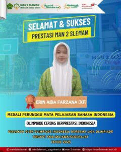 Sleman (MAN 2 Sleman) – Kabar gembira kembali datang dari MAN 2 Sleman. Salah satu siswi berprestasi, Erin Aida Farzana dari kelas X F, berhasil menorehkan prestasi gemilang dengan meraih medali perunggu pada mata pelajaran Bahasa Indonesia. Prestasi tersebut diraih dalam Ajang Nasional Olimpiade Cerdas Berprestasi Indonesia yang diselenggarakan oleh Olimpiade Indonesia bekerja sama dengan Liga Olimpiade. Kompetisi berlangsung secara daring pada 2 November 2025.