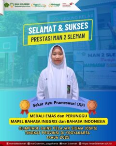 MAN 2 Sleman – Lagi dan lagi prestasi kembali ditorehkan oleh salah satu siswa MAN 2 Sleman. Sekar Ayu Prameswari (X F) berhasil meraih medali emas dan perunggu dalam ajang Olimpiade Sains Pelajar Sigma Mapel Bahasa Inggris dan Bahasa Indonesia jenjang SMA/MA Tingkat Provinsi DI Yogyakarta. Kompetisi bergengsi tingkat provinsi ini diselenggarakan secara daring pada 09-11 November 2025. Tahap selanjutnya, sekar akan meju ke tingkat Nasional yang dijadwalkan 11 Oktober mendatang.