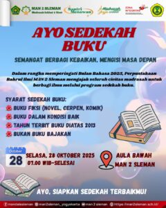 MAN 2 Sleman – Dalam rangka menyemarakkan Bulan Bahasa pada 28 Oktober 2025, Perpustakaan Bahrul Ilmi MAN 2 Sleman bekerja sama dengan Tim P5RA dan OSIS Naba Kharisma menyelenggarakan serangkaian kegiatan, salah satunya adalah sedekah buku.