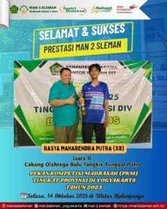 MAN 2 Sleman — Siswa MAN 2 Sleman berhasil menorehkan prestasi pada ajang Pekan Kompetisi Madrasah (PKM) Tingkat Provinsi Tahun 2025. Kompetisi tersebut dilaksanakan pada 14 Oktober 2025 di Kabupaten Kulonprogo. Mewakili Kabupaten Sleman di tingkat MA, Rasya Maharendra Putra (XB) sukses meraih juara II cabang olahraga Bulutangkis Tunggal Putra pada ajang tersebut.