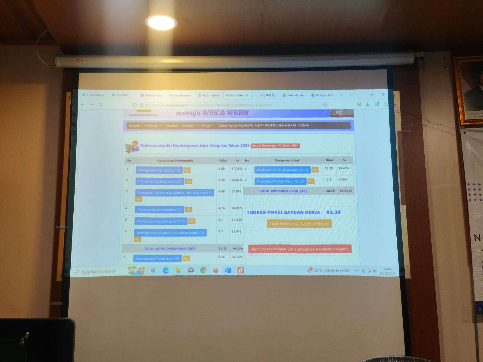 Selama acara, Sekretaris ZI MAN 2 Sleman turut menyampaikan informasi mengenai hasil penilaian yang sudah diterima. MAN 2 Sleman berhasil memperoleh nilai sebesar 93,39% dalam Penilaian Mandiri ZI, sebuah pencapaian yang sangat membanggakan dan menjadi langkah maju bagi madrasah untuk mewujudkan zona integritas yang bersih dan melayani.